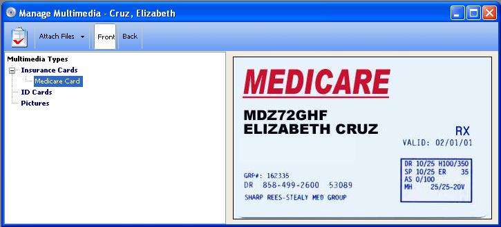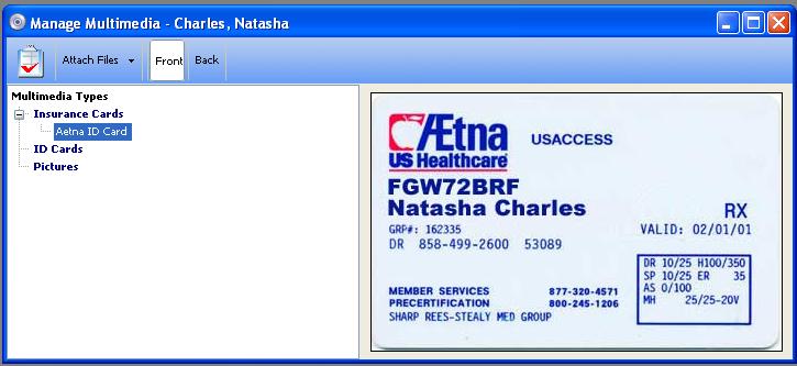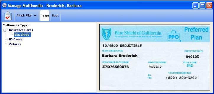 MedOffice allows you to attach any type of file to a patient's record. For example, the screen shots below show how three patients each have had their insurance ID card scanned into their MedOffice record. You can also attach video and sound files to a patient record.
